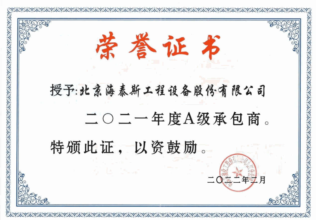 海泰斯獲評“A級承包商”榮譽(yù)稱號